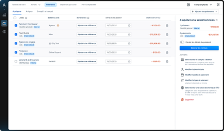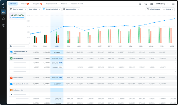 Il réunit tous les leviers de gestion de la trésorerie en une interface unique et intuitive. Fini les fichiers Excel et les outils fragmentés : place à un pilotage intelligent et intégré.